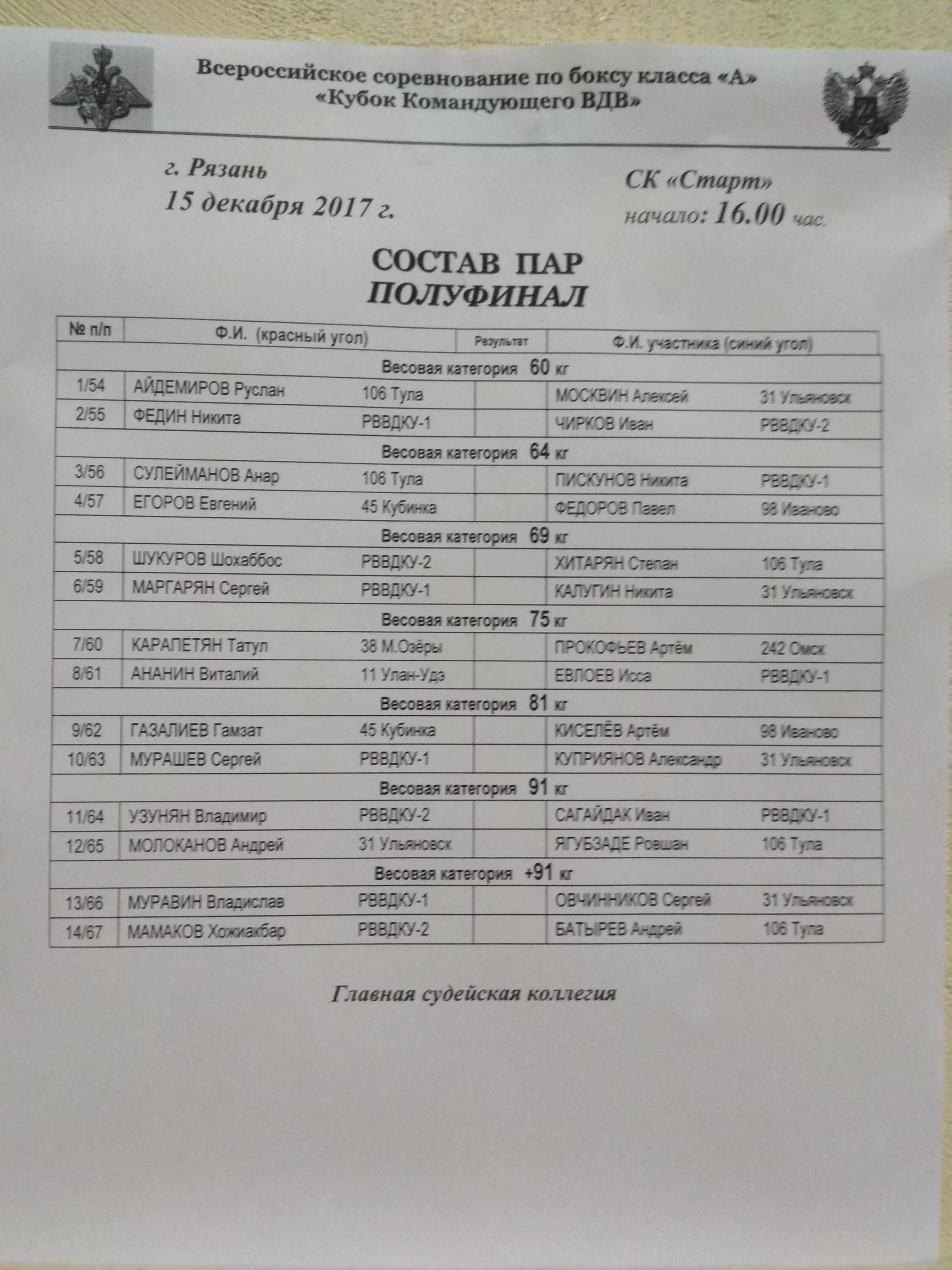 Состав полуфинальных пар Кубка ВДВ в Рязани