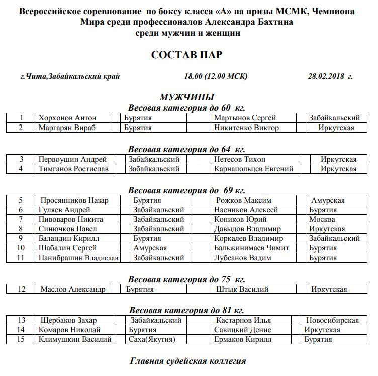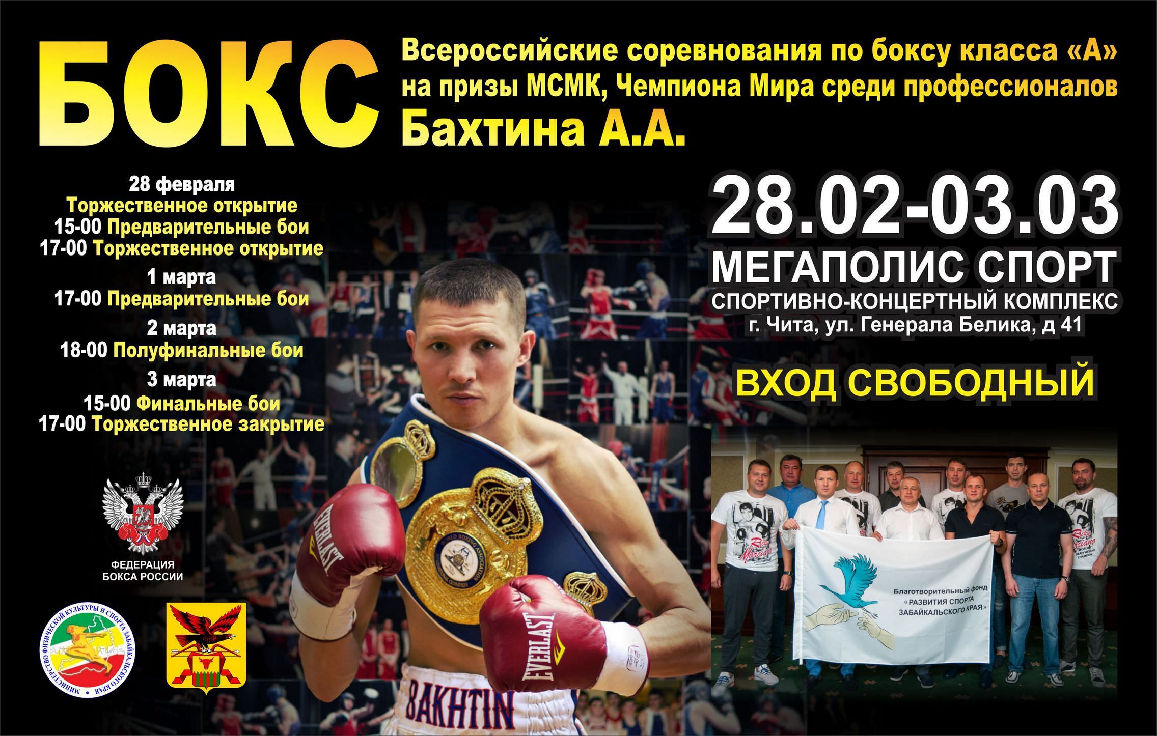 С 28 февраля по 3 марта в городе Чите, в спортивном комплексе «Мегаполис Спорт», по улице Генерала Белика, 41, состоится Всероссийский турнир по боксу класса «А» на призы мастера спорта международного класса, чемпиона Мира среди профессионалов Александра Бахтина.