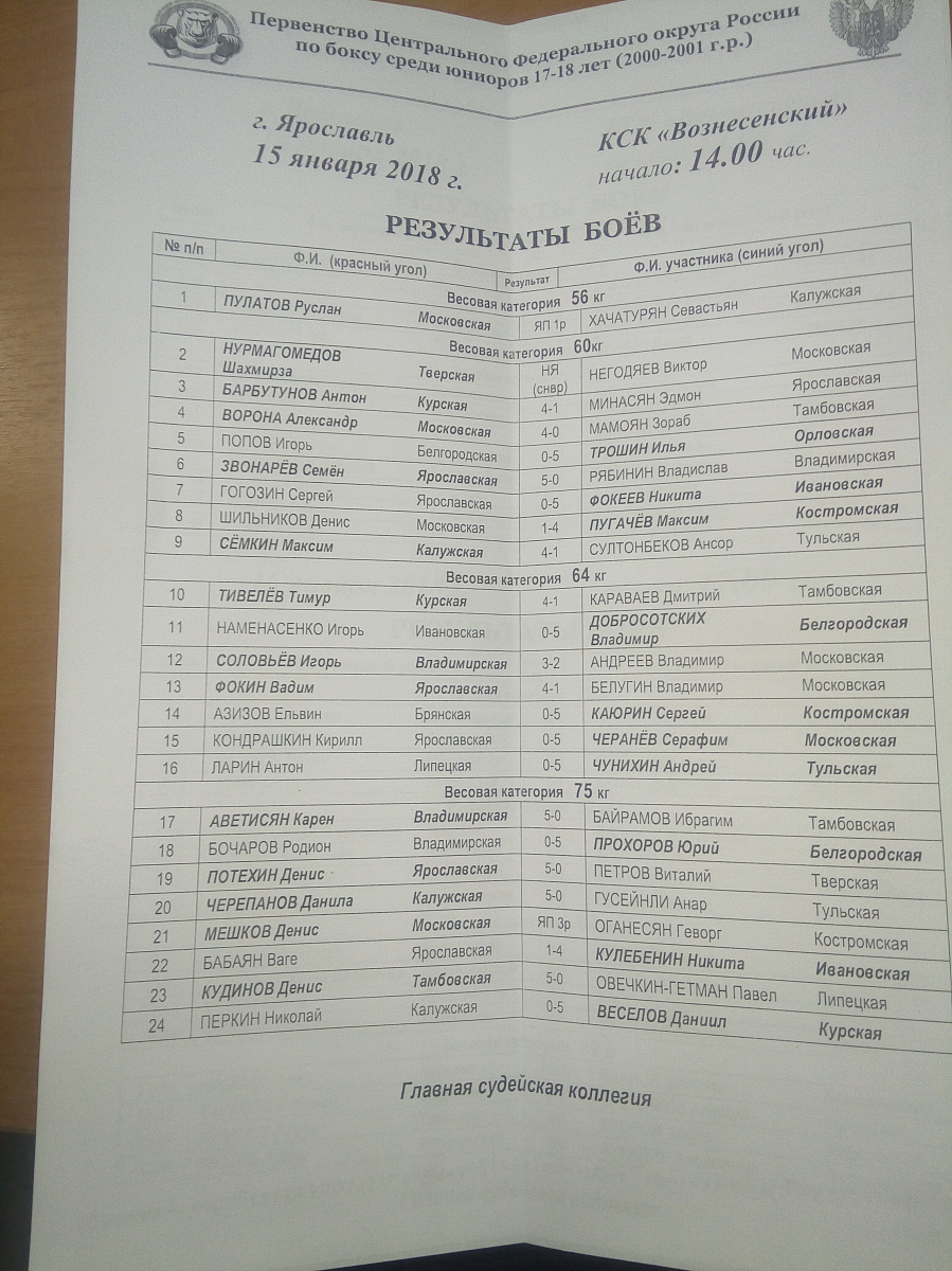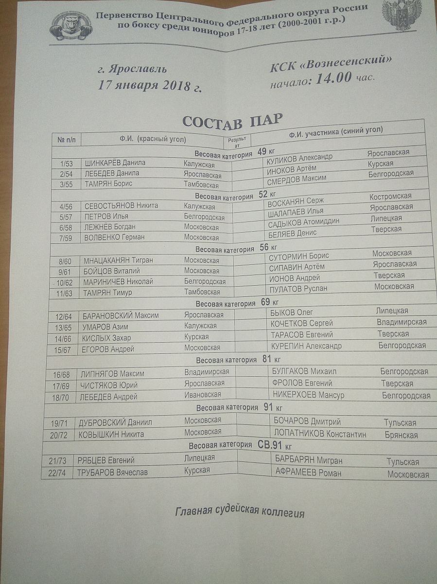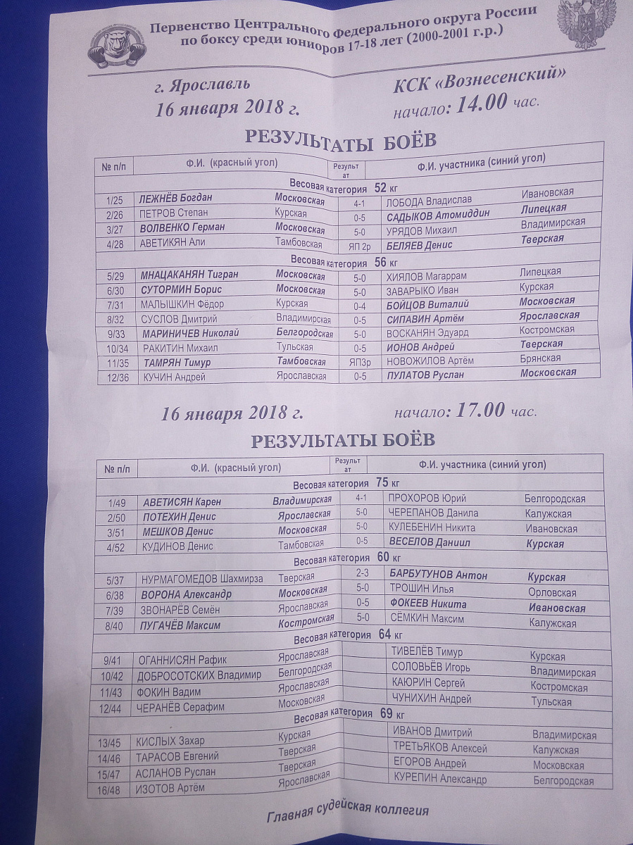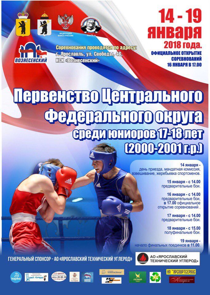 В Ярославле продолжается первенство ЦФО среди юниоров 17-18 лет С 14 по 19 января 2018 года в КСК “Вознесенский” будет проходить первенство Центрального федерального округа по боксу среди юниоров 17-18 лет. В соревнованиях примут участие сборные команды городов ЦФО, спортсмены которых поборются за первое место, тем самым завоевав путевки на первенство России, которое будет проходить с 10 по 16 февраля в г. Сыктывкар (Республика Коми
